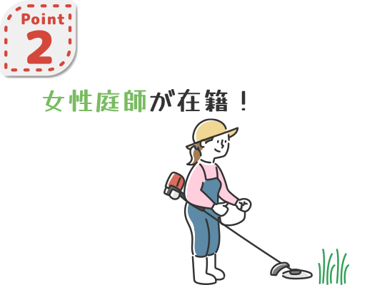 ご安心ください。当方には、女性の庭師が在籍しており、いつでも気軽に要望が言えるよう、お客様とのコミュニケーションは大切にしています。お話をすることが大好きなので、作業中であろうといつでも話しかけてきてください!