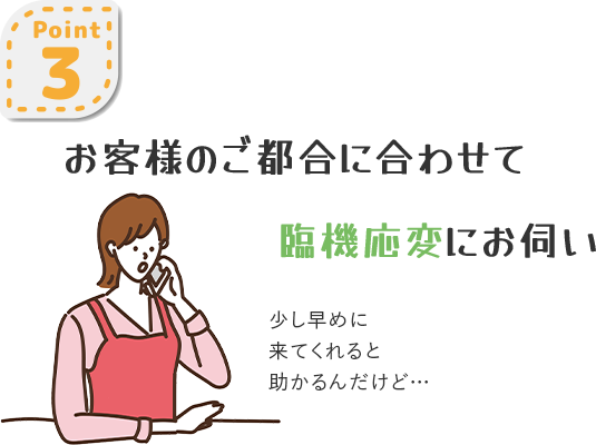 大手の企業様だと、時間の融通は利かない場合が多いです。しかし当方では、営業時間はございますが、ご要望であれば早い時間や遅い時間、土日祝でも対応いたします。